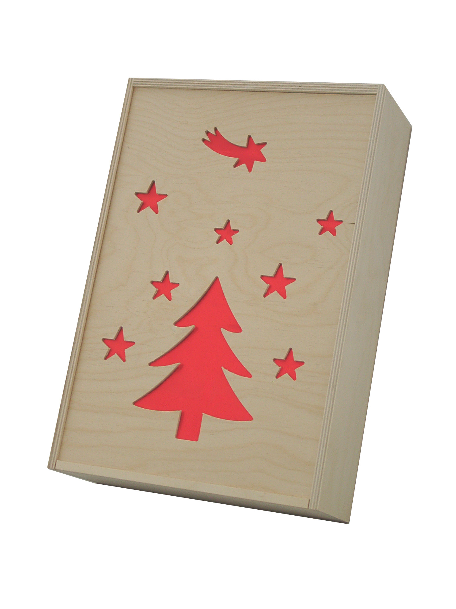 mit ausgesägten Konturen und farbig hinterklebtem Holzschiebedeckel.